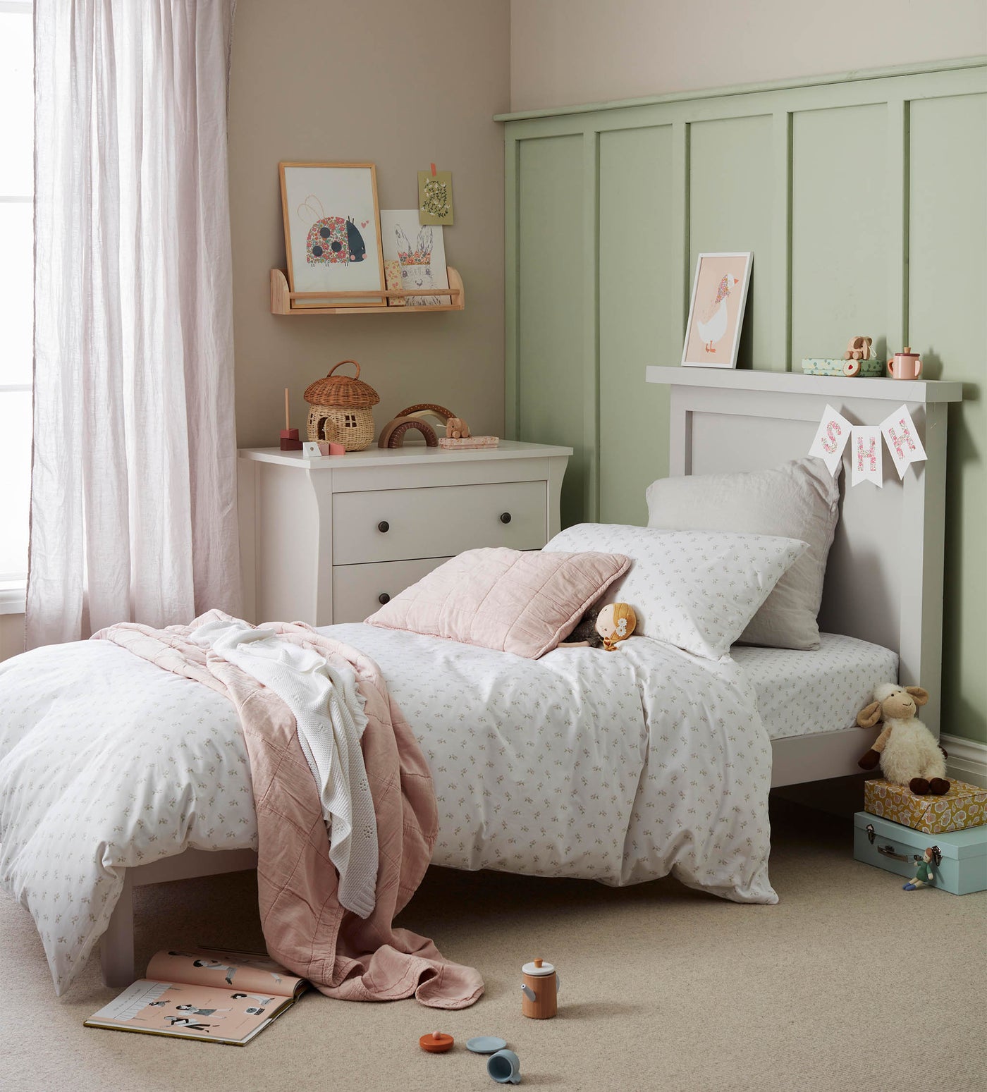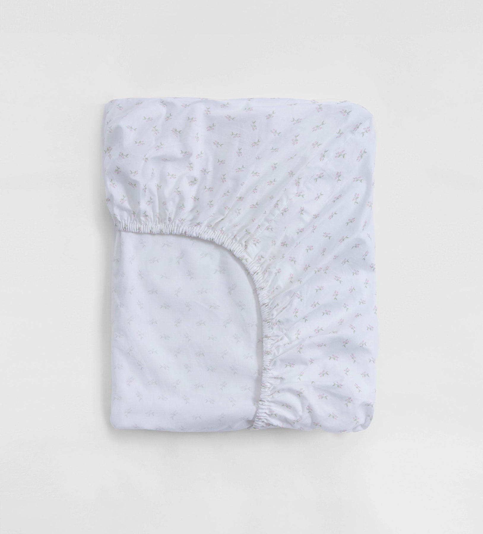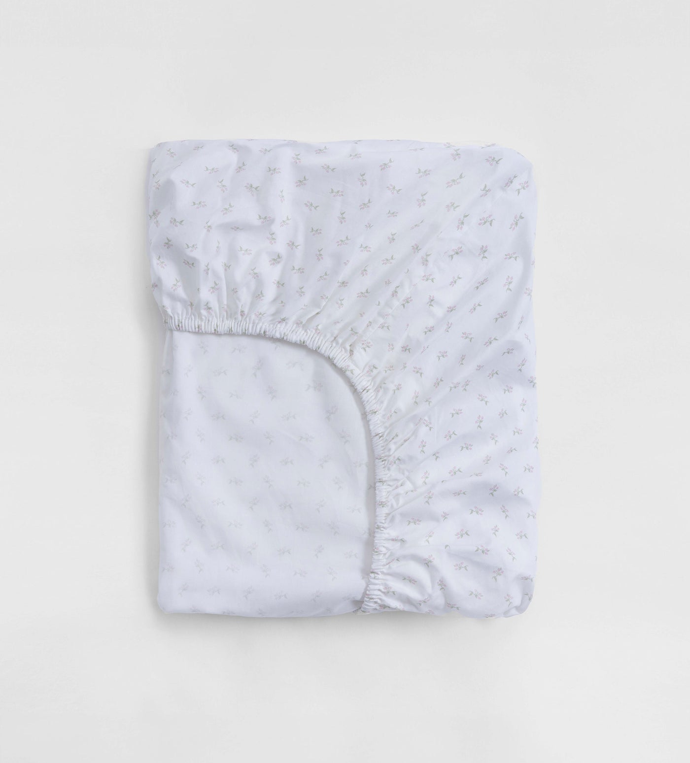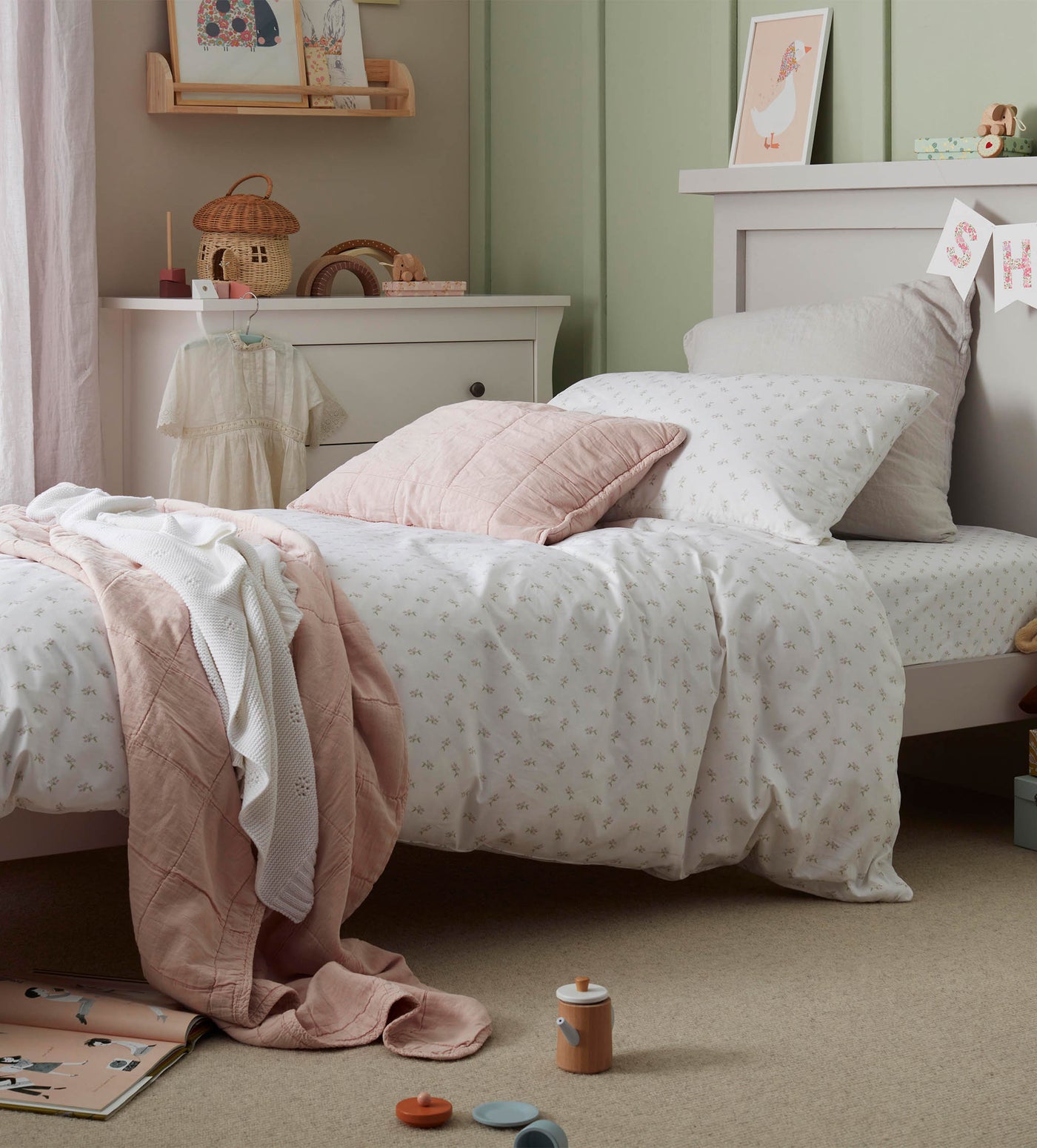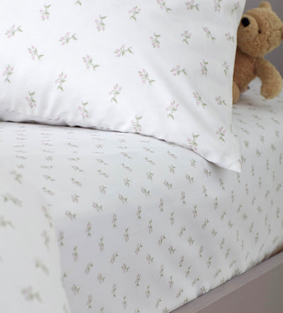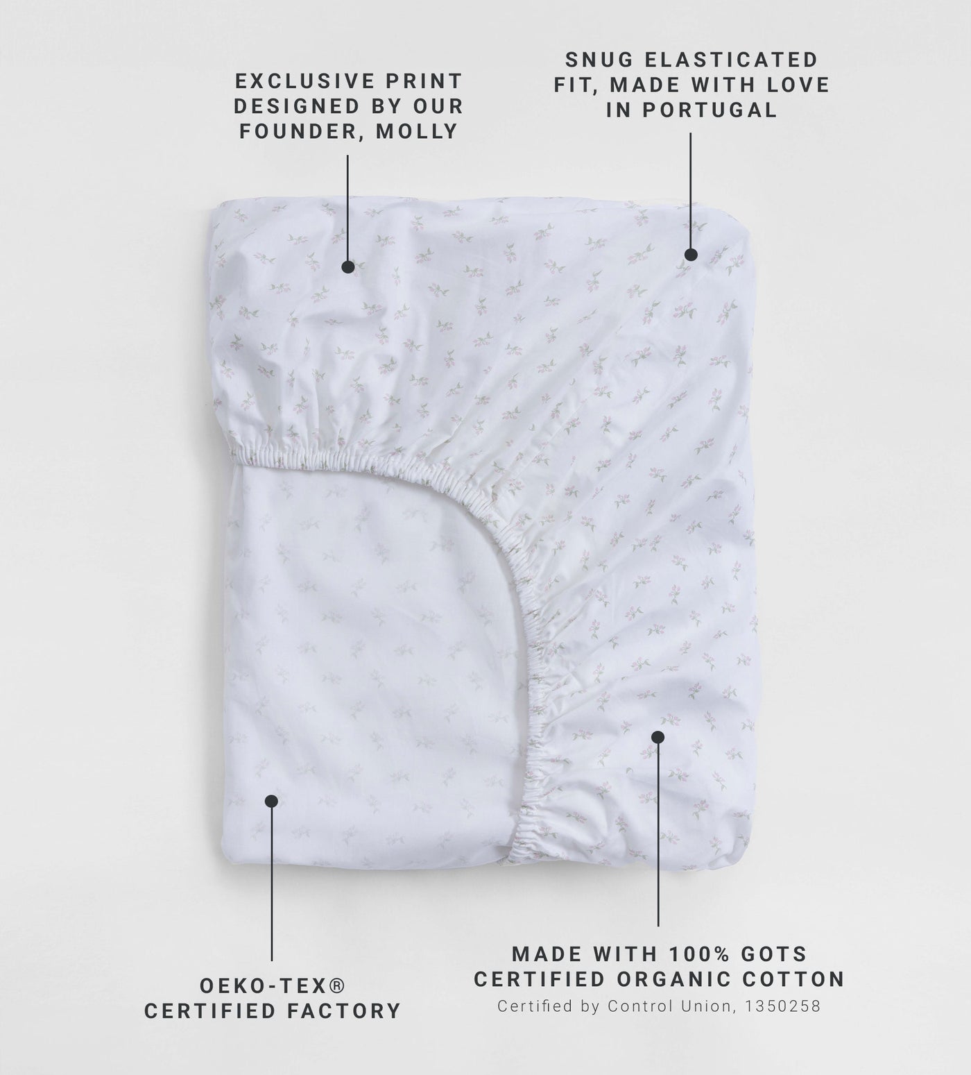 We have pretty floral sheets for even the biggest little beds. Molly’s exclusive hand-drawn floral design really sets White Fleur 100% Organic Cotton Single Fitted Sheet apart from the naptime crowd. Stylish and comfy in white 100% organic cotton, our friends in Portugal have printed pink rosebuds and pretty green leaves all over this lovely sheet and finished it with elastic for a nice snug fit.