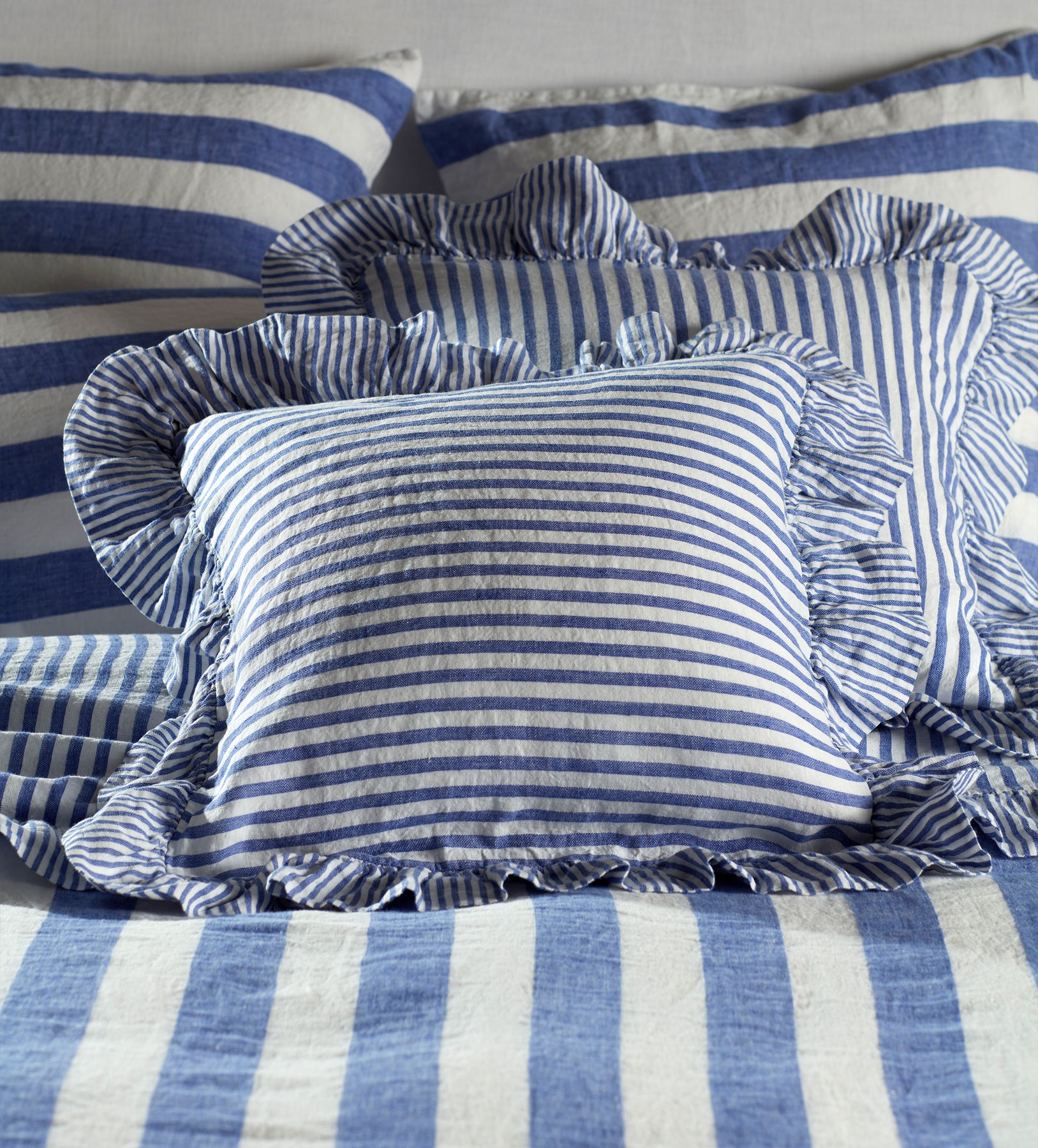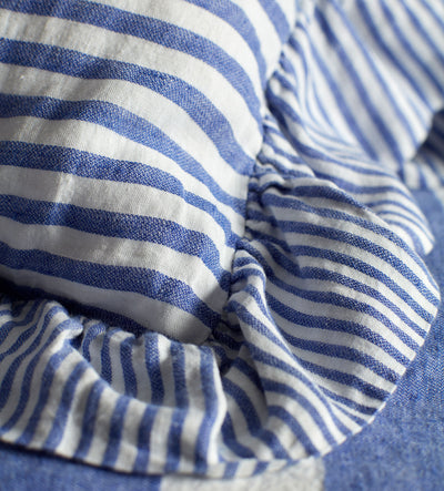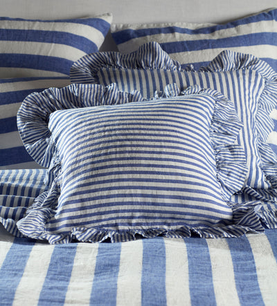 Cobalt Cora Mid Stripe 100% Linen Frill Edge Cushion Cover