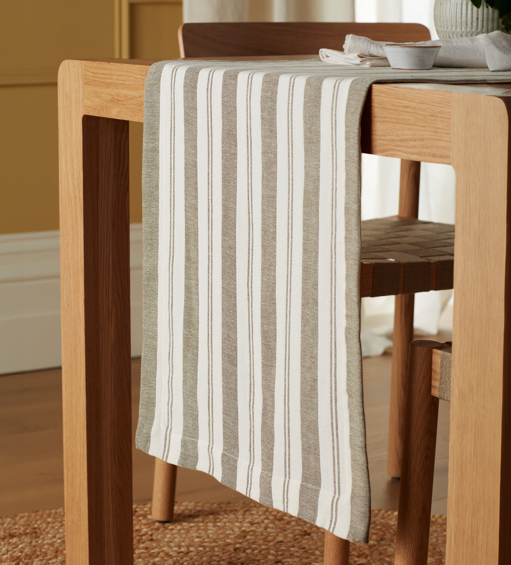 Effortlessly stylish with dark and dreamy stripes, our Dark Olive Isaac 100% Cotton Table Runner makes a perfect partner for any lucky dining table. This runner is woven with love in Portugal from soft and supple cotton with neatly mitred edges, for look that is both polished and relaxed. Whether it’s a cosy supper or a bustling dinner party, Olive Isaac sets the scene for memorable mealtimes.