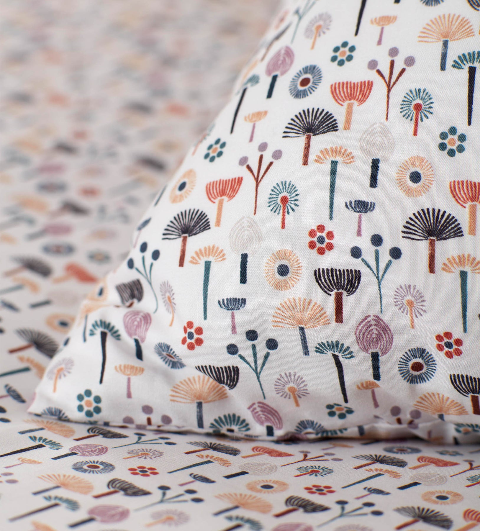 We are dizzy with delight to add this pretty child’s duvet set to our collection. The Molly Meadow 100% Organic Cotton Duvet Cover Set features a sweet botanical design in teal, rust, pink and yellow, all printed on off-white 100% organic cotton.