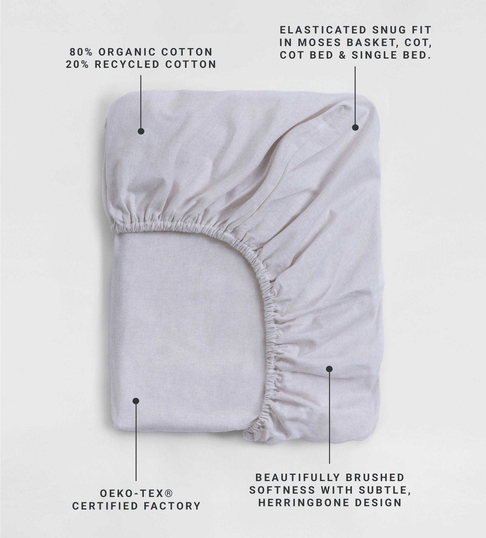 Our Natural Brushed Cotton Fitted Sheet really goes the extra mile to make bedtime soft and cosy. It’s made from a lovely organic cotton and recycled cotton blend (with a natural melange yarn that gives it a delightfully subtle multi-tonal appearance), which is then brushed to snuggly perfection. With elasticated edges ensuring a secure fit, this sheet is perfectly paired with our natural brushed cotton duvet set to create the softest, warmest bedtime for little ones.